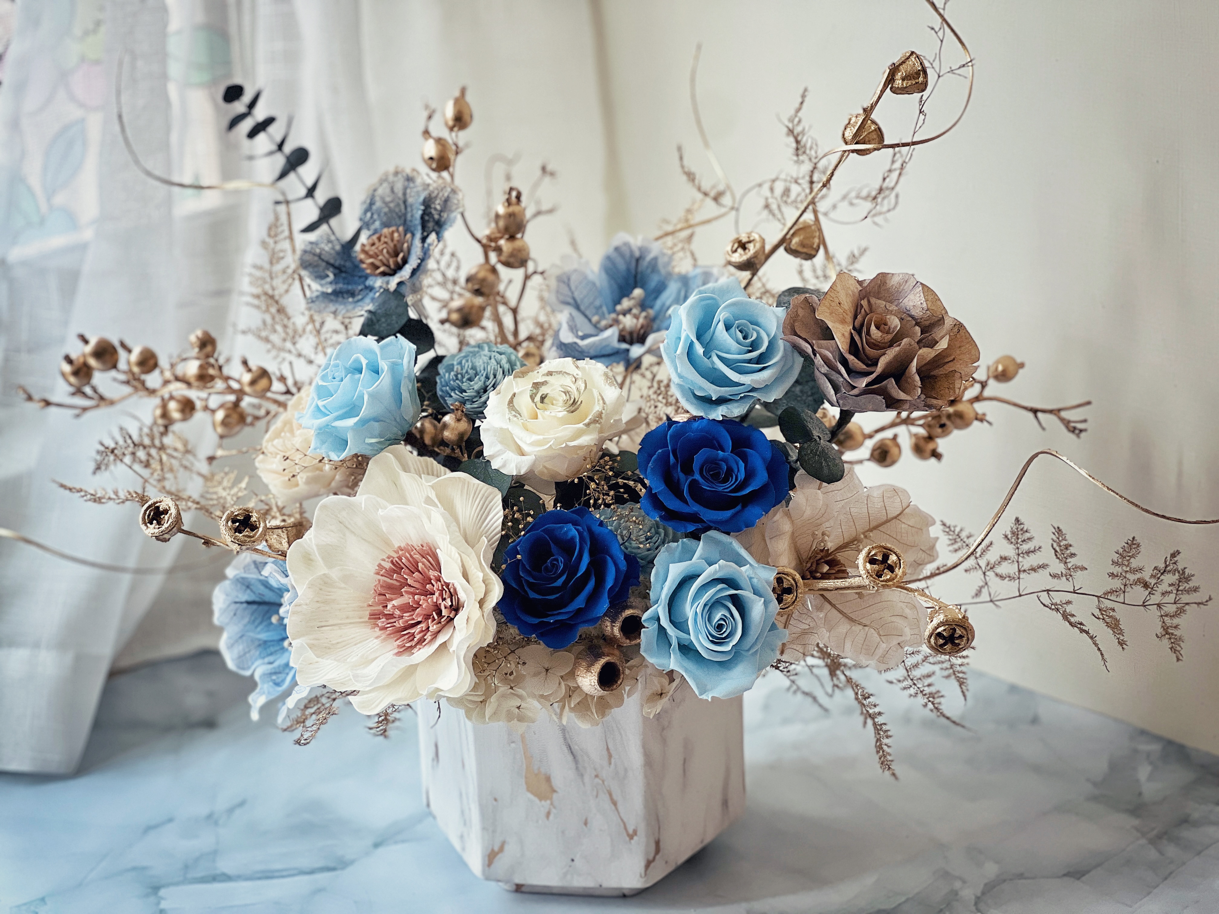 永生花在正常室內環境,保存可超過1~2年以上,若有潮濕、灰塵的狀況,可用吹風機冷風吹拂,即可恢復原狀。