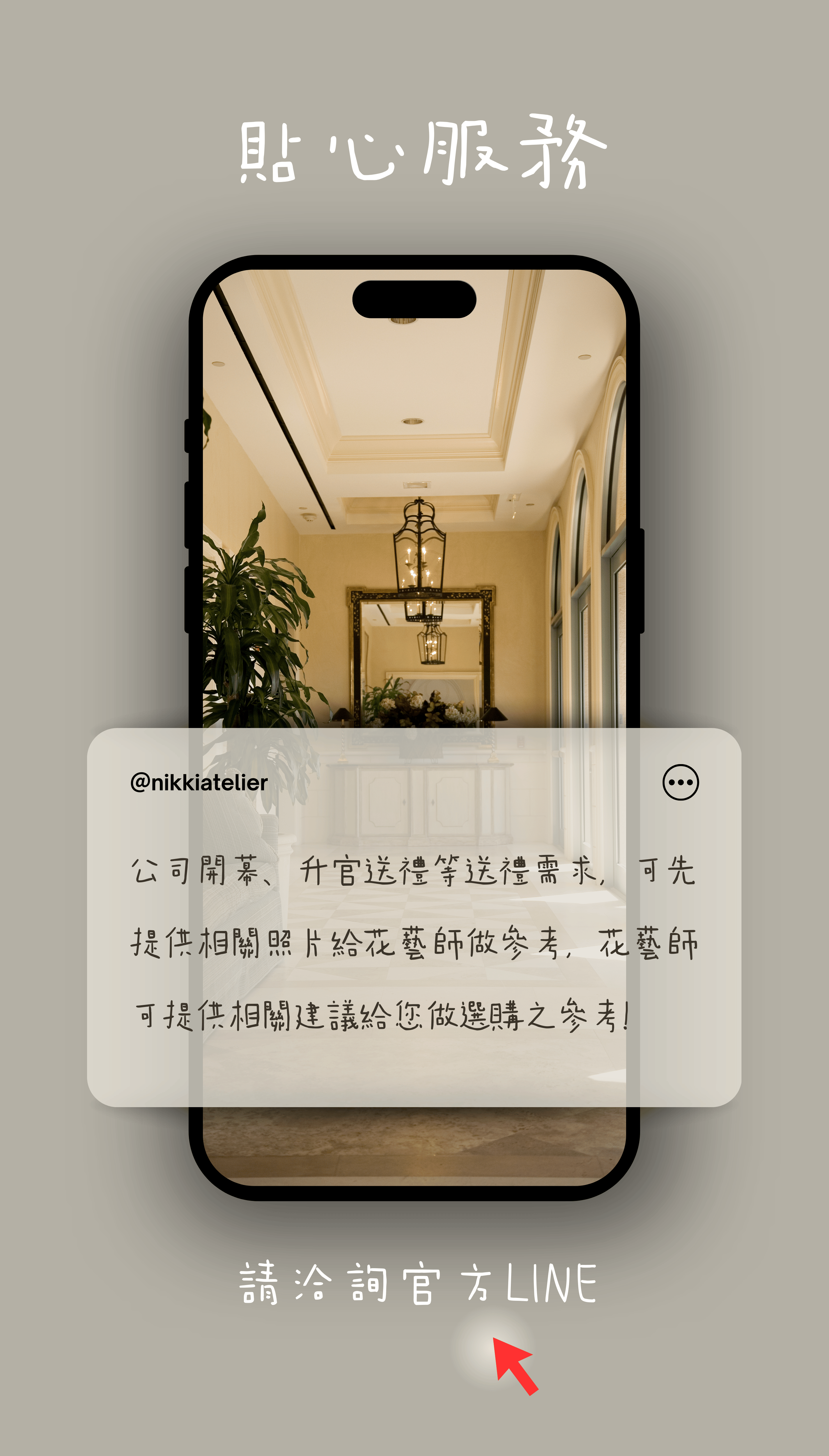 Nikki Atelier可依您的預算和喜好色系做客製服務,歡迎私訊官方line帳號,與我們聯繫,花藝師將依您的需求設計適合之花禮!