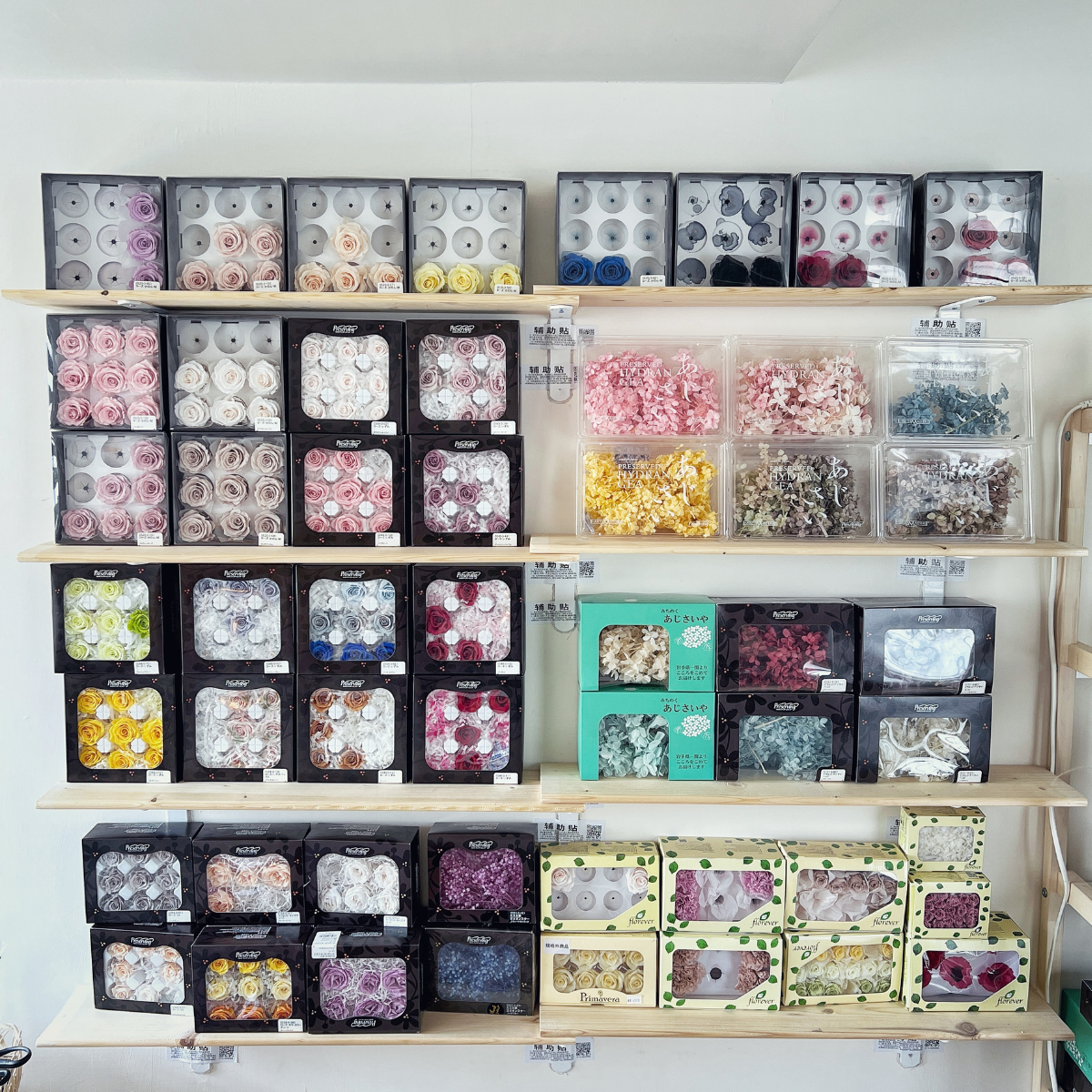2.本課程花材挑選(3朵永生玫瑰、3~4朵擴香花、各式永生乾燥花材)